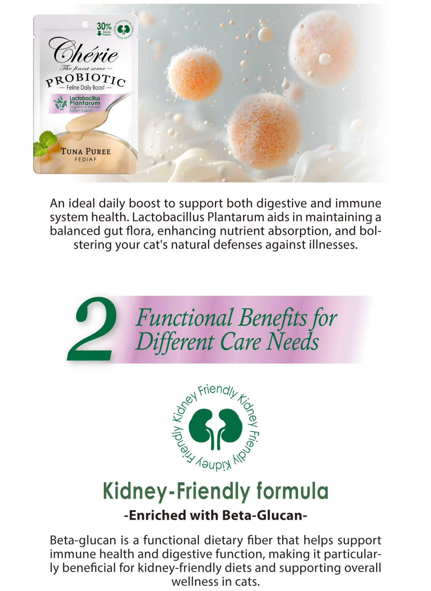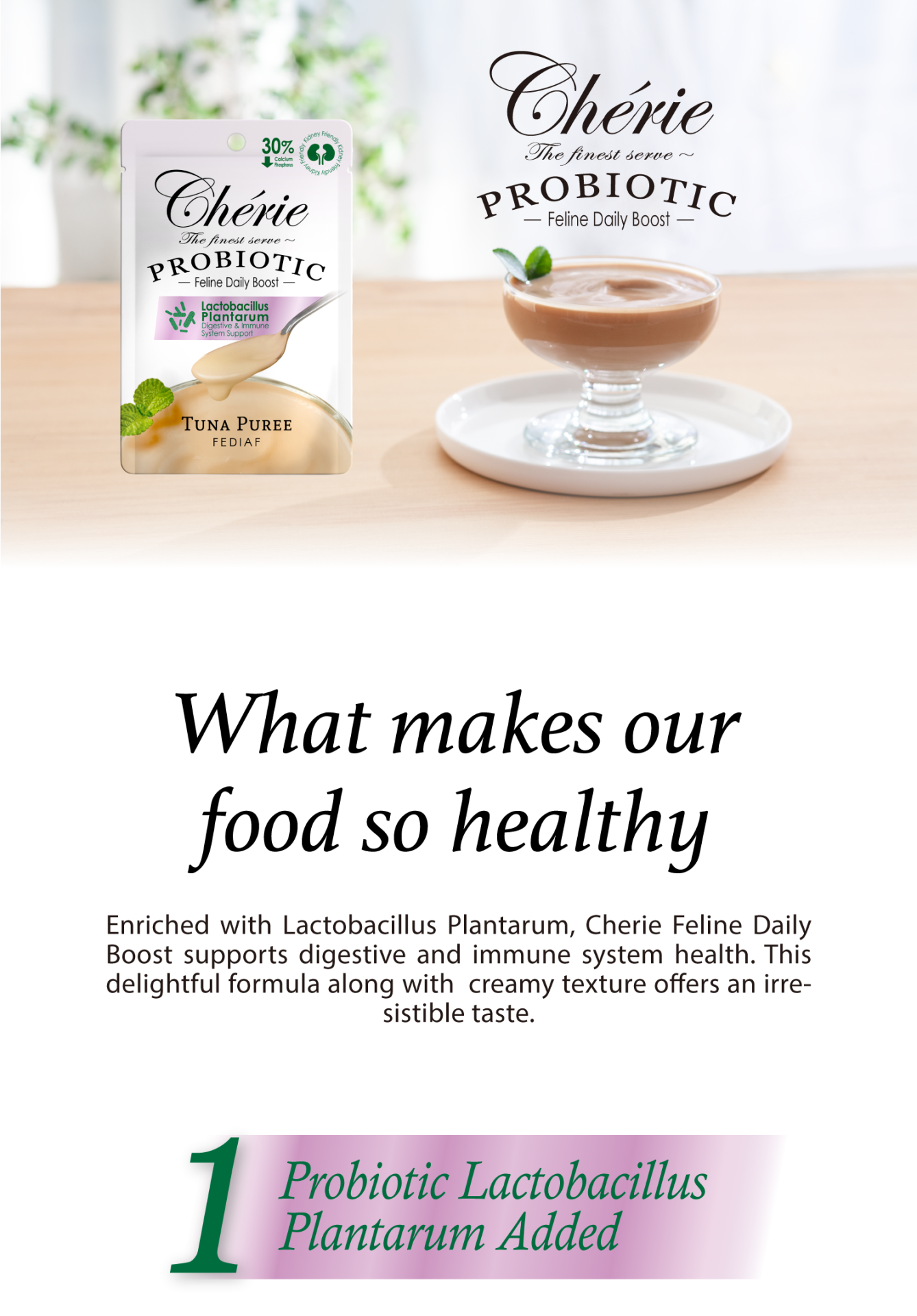 Tuna 20%, Tapioca starch, Sunflower seed oil, Calcium Lactate Pentahydrate, Guar gum, Chicken protein hydrolysate, Beta-glucan, Vitamin E, Choline chloride, Fructo-oligosaccharide, Taurine, Lactobacillus Plantarum, Zinc sulfate heptahydrate, Ascorbic acid, Vitamin B1, Vitamin B3, Ferrous Sulphate Monohydrate, Calcium -D- Pantothenate, Vitamin A, Vitamin B2, Vitamin B6, Manganese Sulphate Monohydrate, Copper sulphate pentahydrate, Vitamin B9, Biotin, Vitamin B12, Water